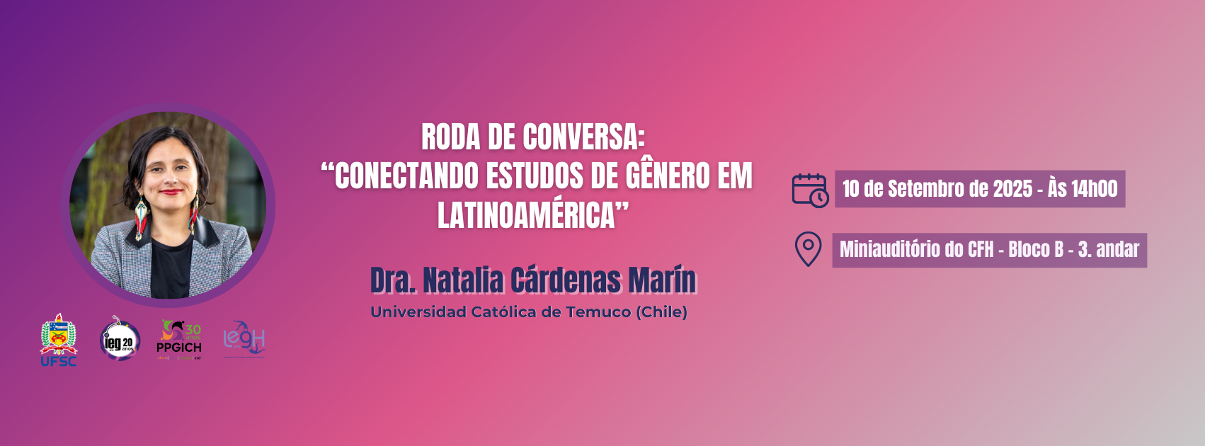É com grande satisfação que o Instituto de Estudos de Gênero da Universidade Federal de Santa Catarina (IEG/UFSC) anuncia a realização da roda de conversa “Conectando estudos de gênero em Latinoamérica”, com a participação convidada Dra. Natalia Cárdeas Marín, doutora em Estudos Interculturais pela Universidad Católica de Temuco (Chile).