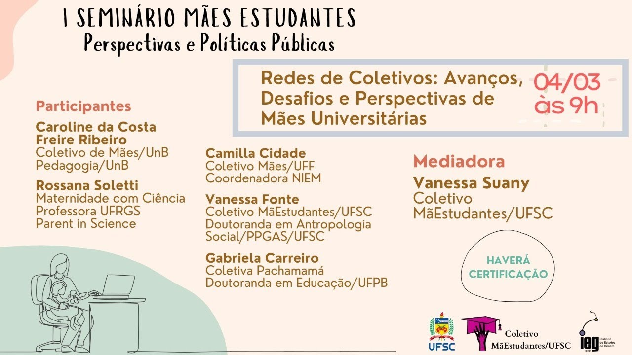 I Seminário Mães Estudantes - Perspectivas e Políticas Públicas. Mesa 5 - Redes de Coletivos: Avanços, Desafios e Perspectivas de Mães Universitárias, realizada em 04/03/2022. Participantes: Caroline da Costa Freire Ribeiro - Coletivo de Mães/UnB, Pedagogia/UnB; Rossana Soletti - Maternidade com Ciência, Professora UFRGS, Parent in Science; Camilla Cidade - Coletivo Mães/UFF, Coordenadora NIEM; Vanessa Fonte - Coletivo MãEstudantes/UFSC, Doutoranda em Antropologia Social/PPGAS/UFSC; Gabriela Carreiro - Coletiva Pachamamá, Doutoranda em Educação/UFPB.