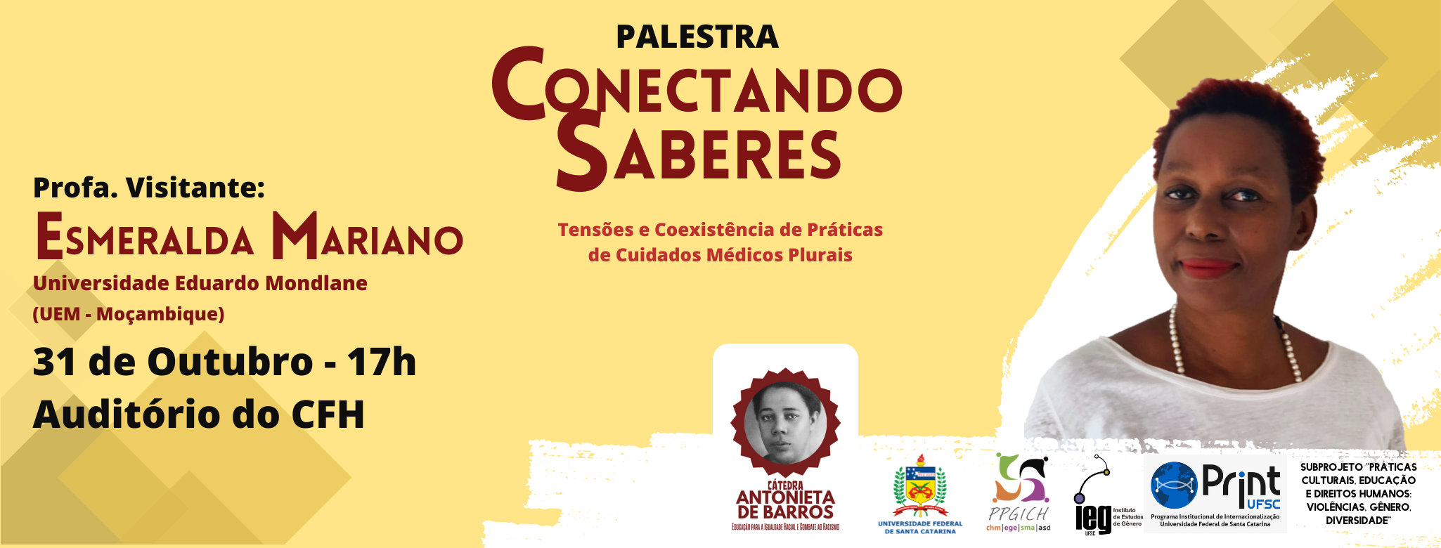 No dia 31 de outubro Esmeralda Mariano realiza a palestra "Conectando Saberes: tensões e coexistência de práticas de cuidados médicos plurais", onde irá dialogar sobre suas pesquisas acerca da medicina popular e da biomedicina. A iniciativa tem o apoio da Cátedra Antonieta de Barros: educação para a igualdade racial e combate ao racismo, que é uma iniciativa que vem construindo ações na UFSC de combate ao racismo. Tem ainda o apoio do Instituto Kadila de Estudos Africanos e das Diásporas/UFSC, que tem suas atividades voltadas para o ensino, a pesquisa e a extensão no campo dos estudos africanos e das diásporas.