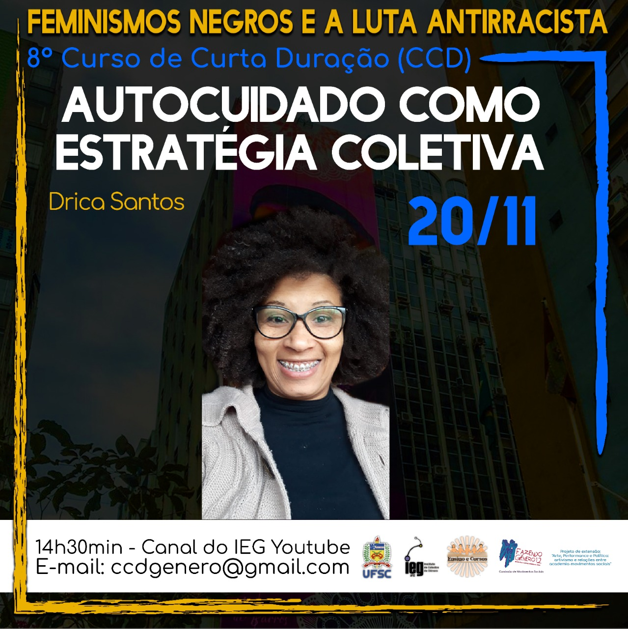 Nesta sexta (20), na aula "Autocuidado como estratégia coletiva", teremos como atração cultural a artista Drica Santos. Saiba mais!